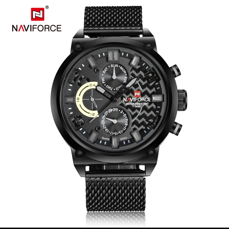 ساعت مچی اورجینال مردانه ناوی فورس|Naviforce|نوی فورس|نیوی فورس سه موتوره فول تایم مشکی | مشکی| مشکی| کد رفرنس NF9089