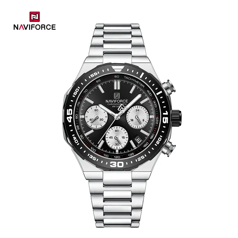 ساعت مچی اورجینال مردانه ناوی فورس|Naviforce|نوی فورس|نیوی فورس سه موتوره کرنوگراف نقره ای | مشکی| نقره ای-مشکی| کد رفرنس NF8075 S/W/B