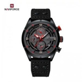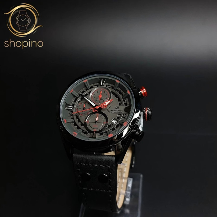 ساعت مچی مردانه Naviforce مدل NF8045 | بند چرمی مشکی، صفحه مشکی، قاب مشکی | اسپرت و کورنوگراف