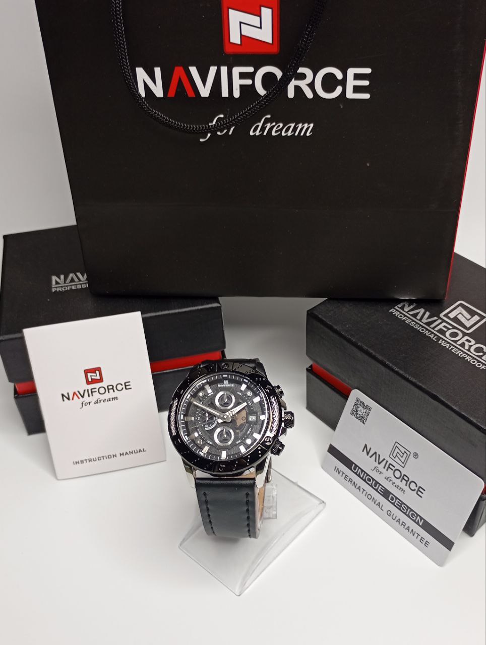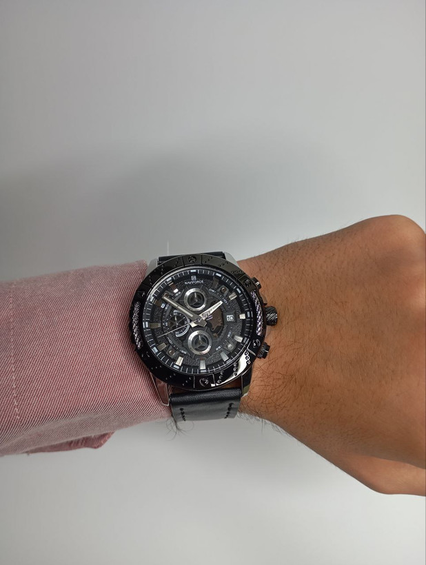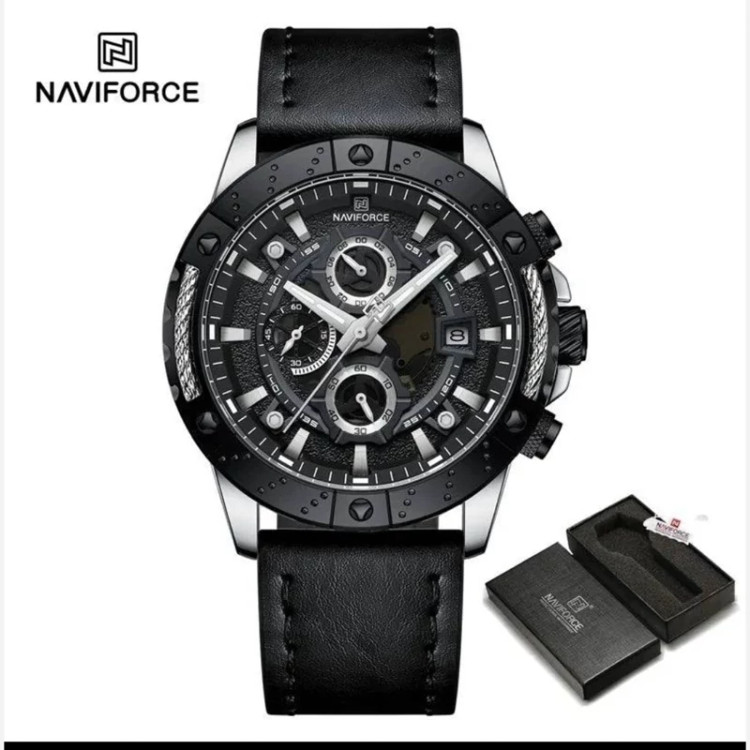 ساعت مچی مردانه نیویفورس مدل Naviforce NF 8055 S/B/B ویژگیهای برجسته: طراحی کرونوگرافی با عملکرد دقیق — قابلیت ثبت زمانهای دقیق همراه با نمایش تاریخ عقربهها و نشانگر شبنما — خوانایی بهتر در نور کم بند چرمی باکیفیت — رنگ خاکستری استیل هماهنگ با جزئیات مشکی برای ظاهری مدرن وزن سبک (~89 g) — راحت حتی برای استفاده طولانیمدت ضدآب تا 30 متر (3 ATM) — مناسب استفاده روزمره ابعاد مناسب مردانه — قطر 47 mm و ضخامت 14 mm
