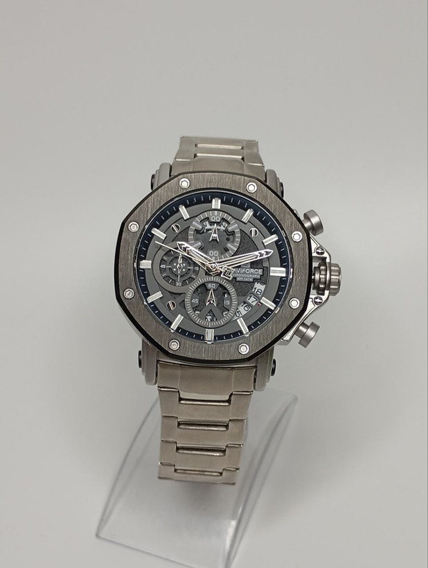 🕒 ساعت مچی مردانه نیویفورس مدل Naviforce NF 8065 S/B/S یک قطعه بیزمان با طراحی قدرتمند و عملکردی پیشرفته — قاب و بند فلزی نقرهای با جزئیات برگرفته از ساعتهای مسابقهای و فرم هشتوجهی. برای آقایانی که کیفیت و کاربرد را در کنار هم میخواهند. نکات کلیدی: کرونوگراف با نمایش تاریخ و تقویم کامل — کاربردی برای زندگی روزمره ⌚ طراحی مدلدار و خاص: بدنهی هشتوجهی با پرداخت برسخورده و تاج محافظدار بند فولاستیل با قفل تاشو ایمن — دوام و راحتی در استفاده وزن ملموس (~161 g) برای حس کیفیت و استحکام ضدآب 3 ATM برای شرایط روزمره خوانایی بالای صفحه با پوشش شبنما ابعاد استاندارد مردانه: قطر 44 mm | ضخامت 14 mm — مناسب اکثر مچها