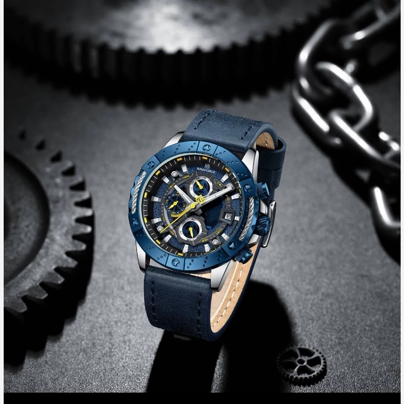 ساعت مچی مردانه Naviforce مدل NF8055 | بند چرمی آبی، صفحه آبی | کرونوگراف و اسپرت